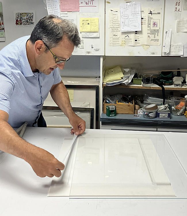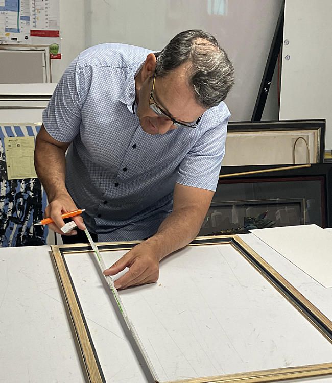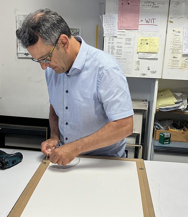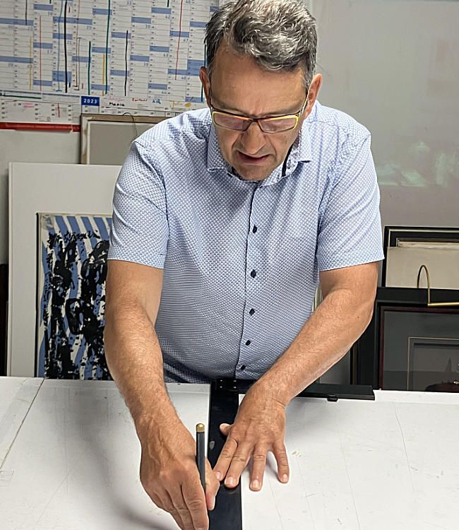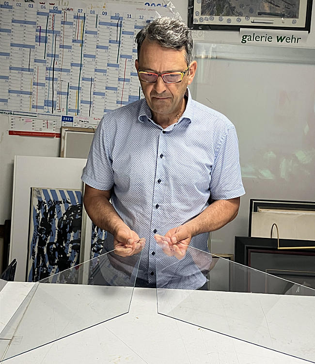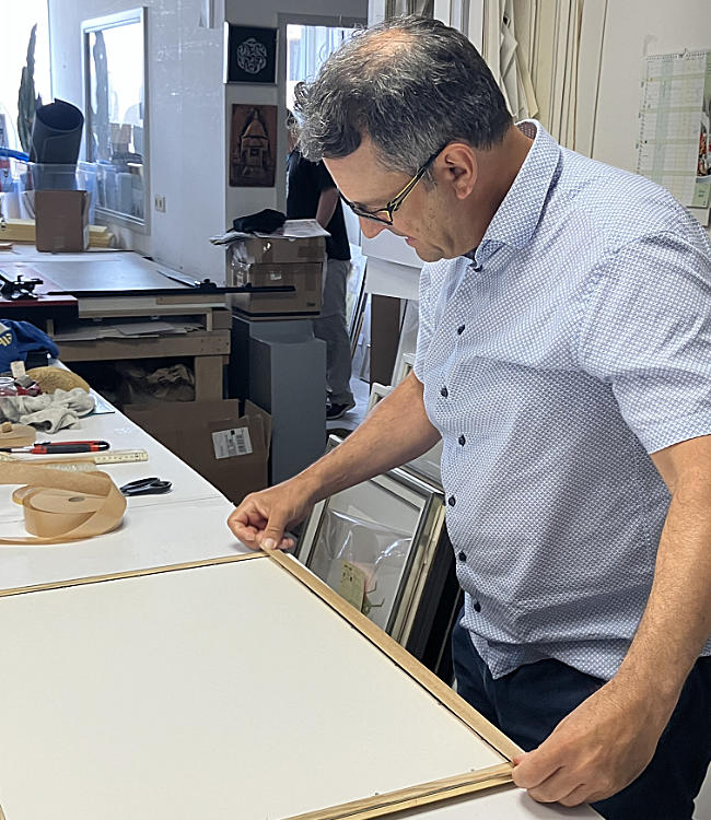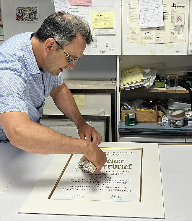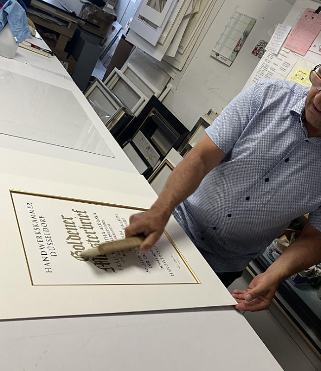 Dem Meister beim Rahmen mal auf die Finger geschaut – hier eine kleine Auswahl der gefühlt tausend präzisen Handgriffe, die es braucht, um solch einen Brief meisterlich zu rahmen.